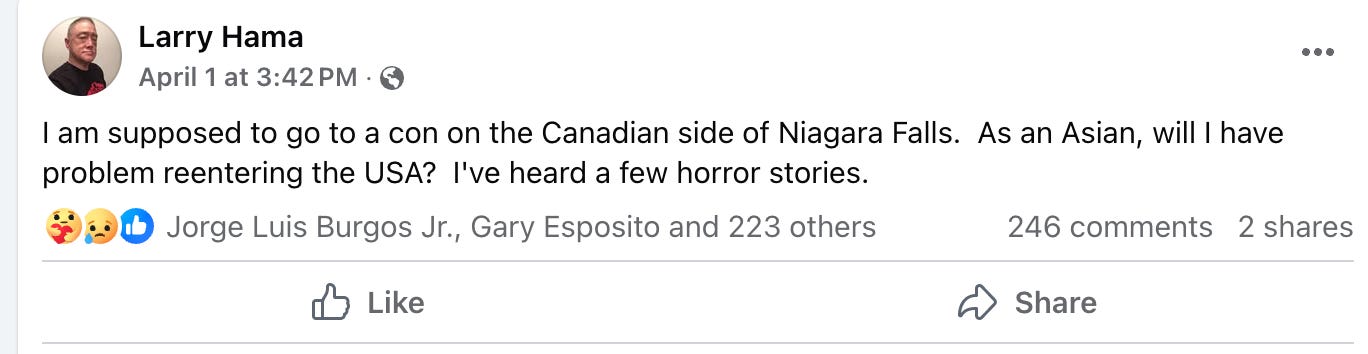 On April 1st, Hama first posted about his fears saying, “I am supposed to go to a con on the Canadian side of Niagara Falls. As an Asian, will I have problem reentering the USA? I've heard a few horror stories.”