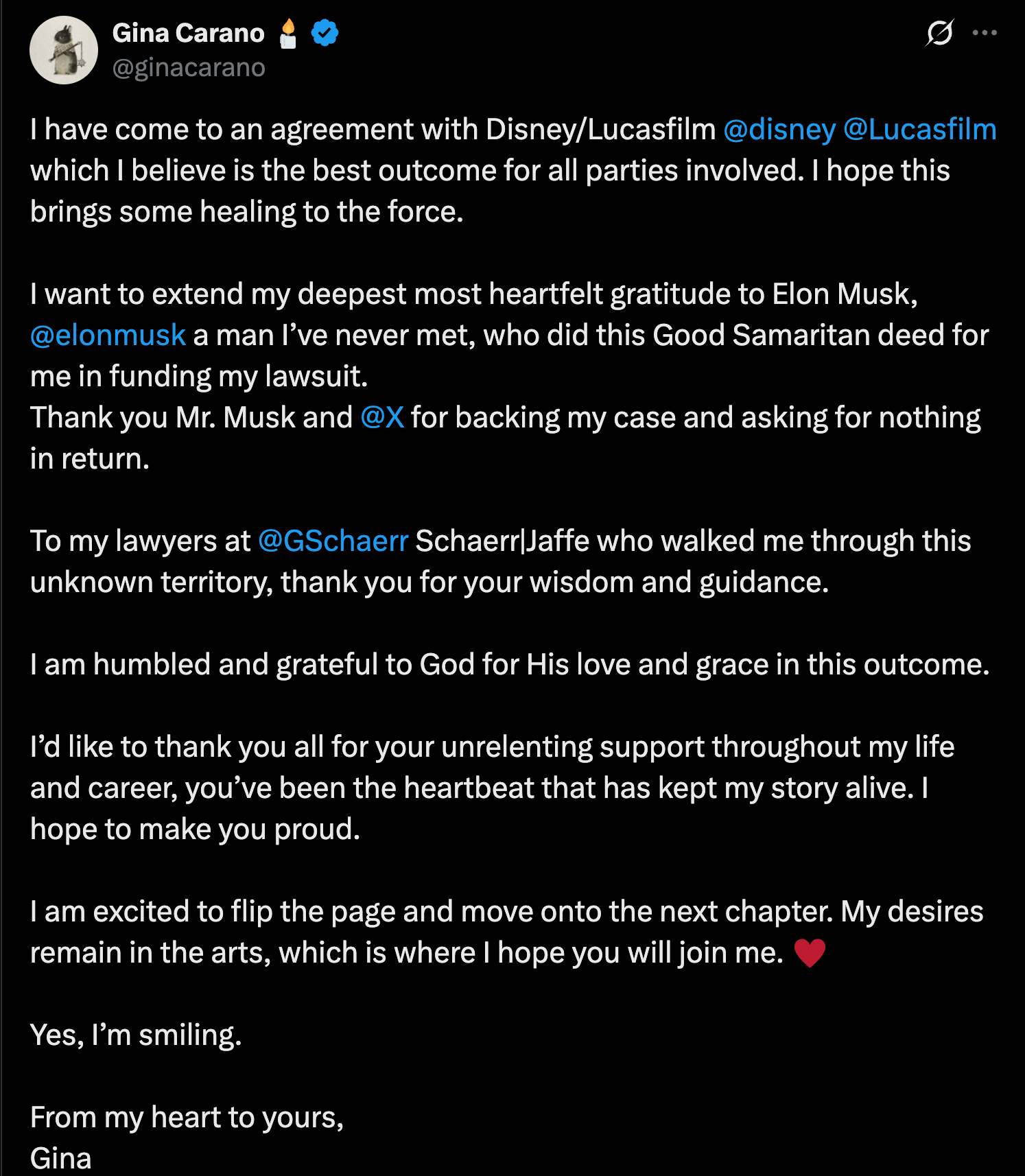 "I have come to an agreement with Disney/Lucasfilm @disney @Lucasfilm which I believe is the best outcome for all parties involved. I hope this brings some healing to the force. I want to extend my deepest most heartfelt gratitude to Elon Musk, @elonmusk a man I've never met, who did this Good Samaritan deed for me in funding my lawsuit. Thank you Mr. Musk and @X for backing my case and asking for nothing in return. To my lawyers at @GSchaerr Schaerr|Jaffe who walked me through this unknown territory, thank you for your wisdom and guidance. I am humbled and grateful to God for His love and grace in this outcome. I'd like to thank you all for your unrelenting support throughout my life and career, you've been the heartbeat that has kept my story alive. I hope to make you proud. I am excited to flip the page and move onto the next chapter. My desires remain in the arts, which is where I hope you will join me. ♥️ Yes, I'm smiling. From my heart to yours, Gina"