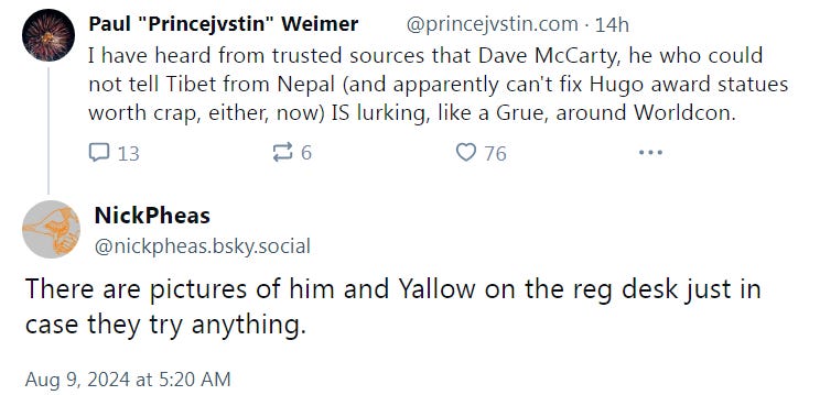 Serial clout chasers in the sci-fi scene like Paul Weimer, alleged pedophile and former reviewer for Barnes and Noble, are gloating about the bannings, saying, "I have heard from trusted sources that Dave McCarty, he who could not tell Tibet from Nepal (and apparently can't fix Hugo award statues worth crap, either, now) IS lurking, like a Grue, around Worldcon."
