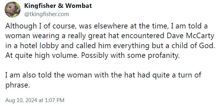 Not to be outdone, woke activist T. Kingfisher decided to try to get her own clout, saying, "Although I of course, was elsewhere at the time, I am told a woman wearing a really great hat encountered Dave McCarty in a hotel lobby and called him everything but a child of God. At quite high volume. Possibly with some profanity. I am also told the woman with the hat had quite a turn of phrase."