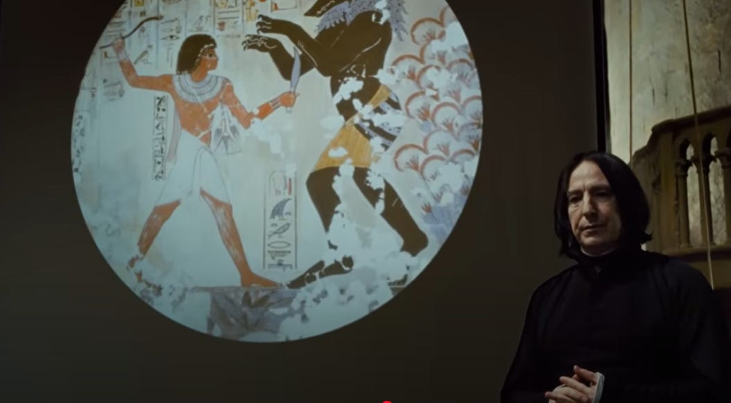 In J.K. Rowling’s Harry Potter and the Sorcerer’s Stone book, she describes Snape, “Professor Quirrel, in his absurd turban, was talking to a teacher with greasy black hair, a hooked nose, and sallow skin.” When Harry asked Percy who the teacher was, Percy replied, “No wonder he’s looking so nervous, that’s Professor Snape.”