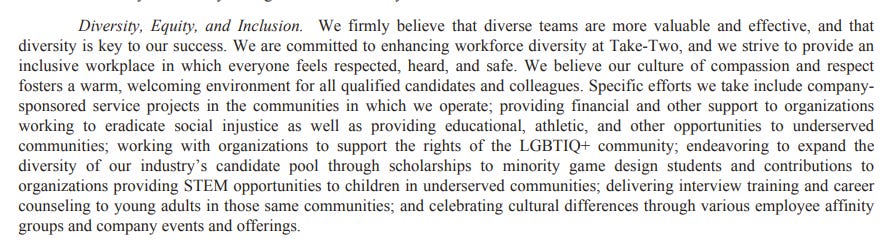 What do you make of Take-Two Interactive dumping this Diversity, Equity, and Inclusion section from their Annual Report?