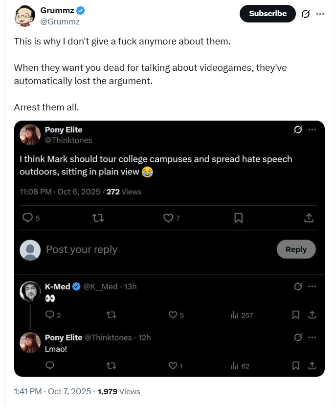 Grummz responded to this apparent call for violence against him by writing on X, “This is why I don’t give a f**k anymore about them. When they want you dead for talking about videogames, they’ve automatically lost the argument. Arrest them all.”