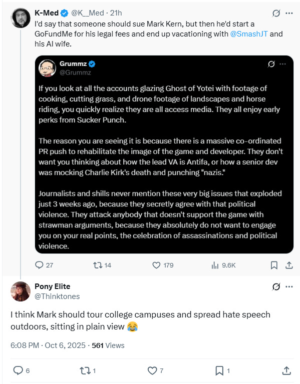 Kern shared his speculation that Sony and its subsidiary Sucker Punch are coordinating with various influences and media outlets as part of “a massive co-ordinated PR push to rehabilitate the image of [Ghost of Yotei] and [Sucker Punch].”