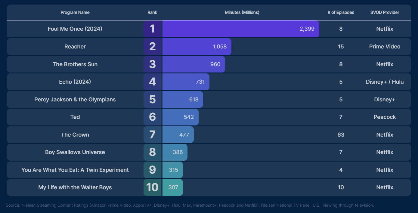 Before Agatha All Along, Marvel Studios dumped all five episodes of Echo onto its platform on the same day. The show debuted on Nielsen’s chart the first week it released with 731 million minutes watched.
