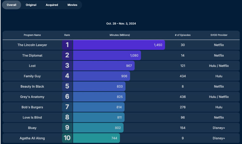 If you simply divide Agatha’s numbers by two it only performed marginally better than The Acolyte at 372 million minutes viewed.
