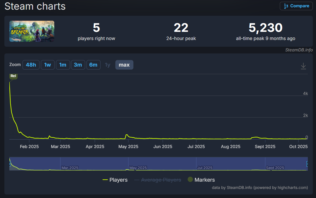 After releasing in January 2025, the game hit a peak concurrent player count of just 5,230. Most recently, the game hit a 24-hour peak of just 22 players.