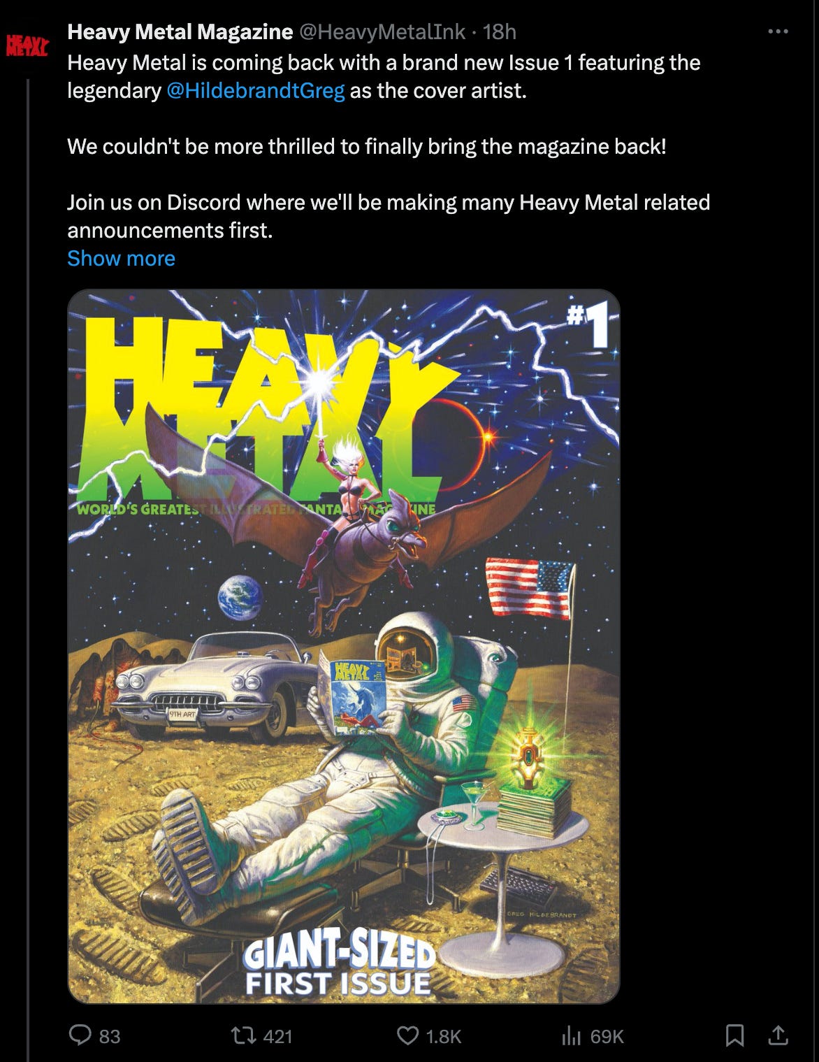 Then, on October 15th, they posted, “Heavy Metal is coming back with a brand new Issue 1 featuring the legendary @HildebrandtGreg as the cover artist. We couldn't be more thrilled to finally bring the magazine back! Join us on Discord where we'll be making many Heavy Metal related announcements first. https://discord.gg/gJAcfUZRtC” along with cover art.