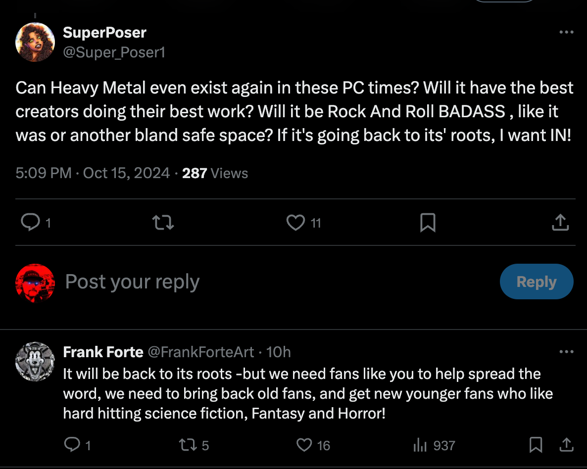 One fan posted, “Can Heavy Metal even exist again in these PC times? Will it have the best creators doing their best work? Will it be Rock And Roll BADASS , like it was or another bland safe space? If it's going back to its' roots, I want IN!”