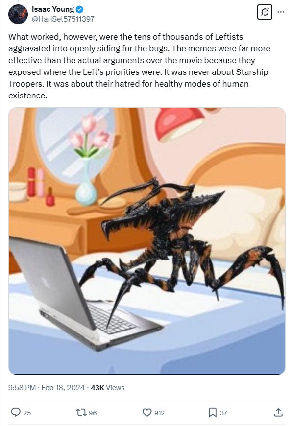 As Young noted in February 2024, “Tens of thousands of Leftists aggravated into openly siding for the bugs. The memes were far more effective than the actual arguments over the movie because they exposed where the Left’s priorities were. It was never about Starship Troopers. It was about their hatred for healthy modes of human existence.”