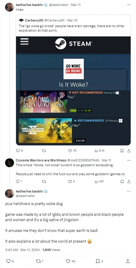 She also indicated that the game was a “big satire of jingoism” and how she thought it was amusing that some players “don’t know that super earth is bad!”