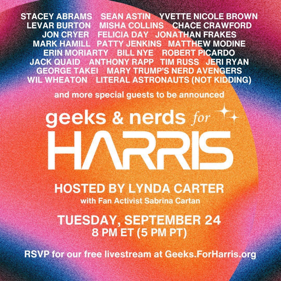 Some of the most insufferable people in Hollywood are hosting “Geeks & Nerds For Harris” tonight as a livestream to try to promote the extreme leftist that all of Hollywood and the mainstream entertainment industry is behind. The event includes Mark Hamill from Star Wars, George Takei from Star Trek, Sean Astin from Lord of the Rings, and Gail Simone from Marvel Comics.