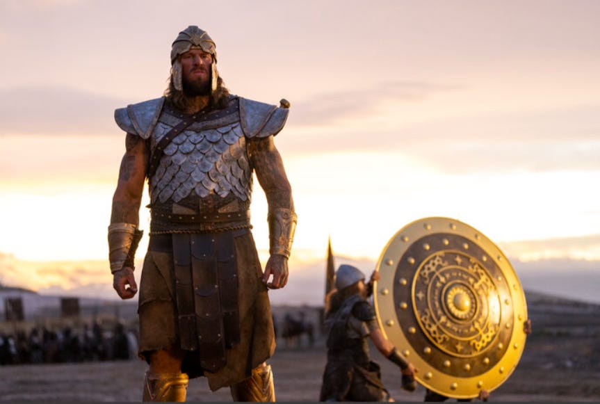 Next, you could engage in the romance subplot with Michal while Saul takes to David and “loved him greatly” as Scripture states. This also gives you the opportunity to depict David as the armor bearer of Saul as Scripture makes clear he is. Something the show makes no mention of. This would be where you might also include Ahinoam’s subplot and there could also be a minor skirmish on a border town between the Israelites and the Philistines with Goliath in their ranks.