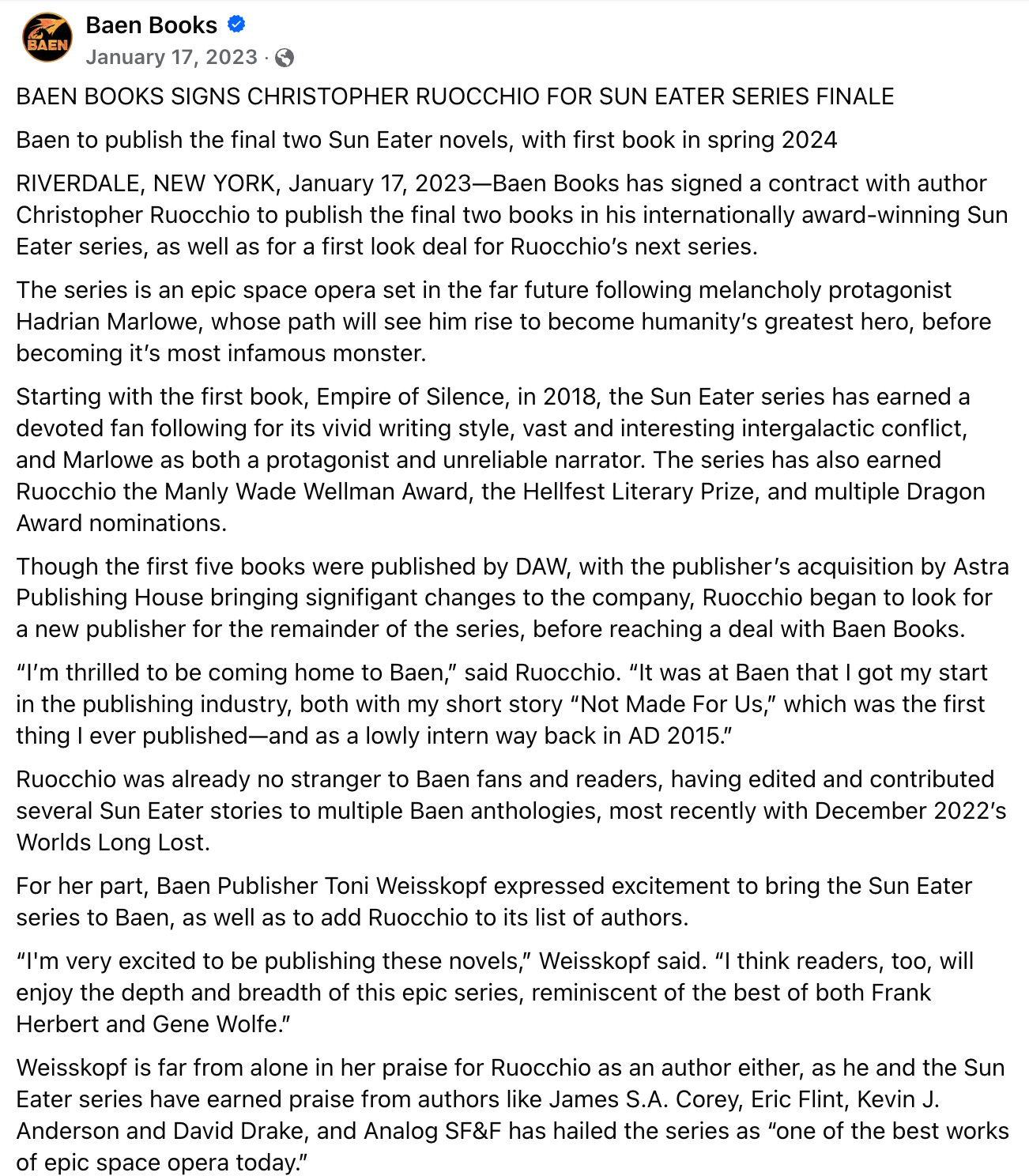 On January 17, 2023, Baen Books announced its acquisition of Christopher Ruocchio’s Sun Eater series from DAW Books to publish the final two books in his space opera series. Sun Eater has outsold much of the industry by leaps and bounds with a poignant character fans love, giving a feel much like Dune in its scope. The pickup appeared to be a huge win for Baen Books who needed younger talent like Ruocchio with many of their bestselling authors aging in the market.