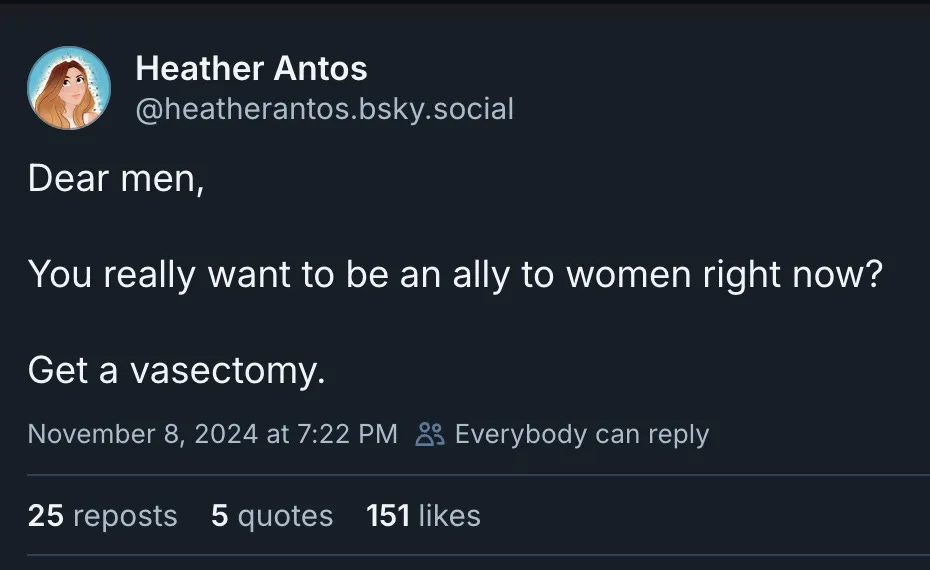 As she melted down over the election of Donald Trump, she posted a bizarre call for men to sterilize themselves because of the election, “Dear men, You really want to be an ally to women right now? Get a vasectomy.”