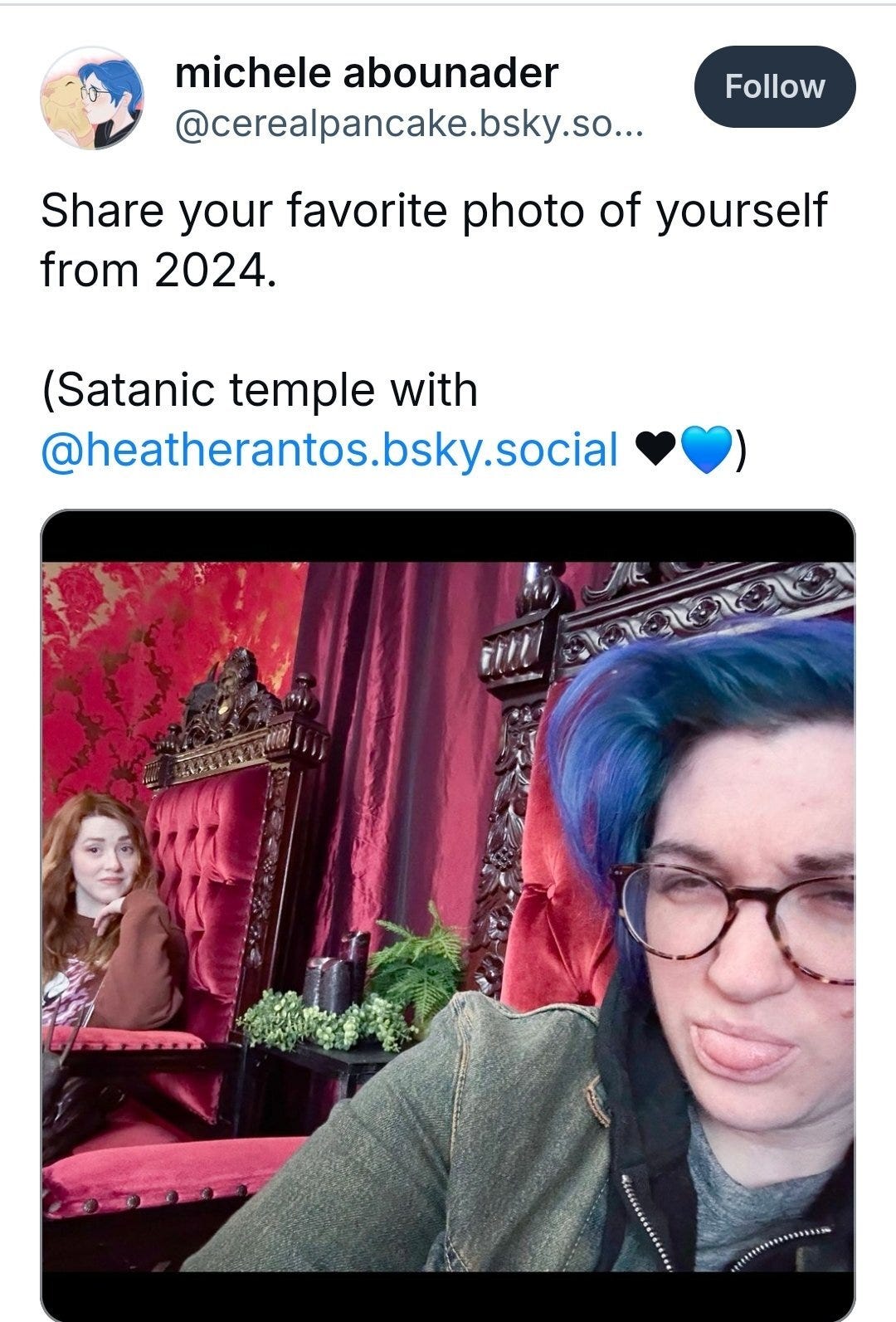 Now she’s been caught actually attending a Satanic Temple with a man who’s pretending to be a woman who’s using the name Michele Abounader. He posted to BlueSky, “Share your favorite photo of yourself from 2024. (Satanic temple with @heatherantos.bsky.social)