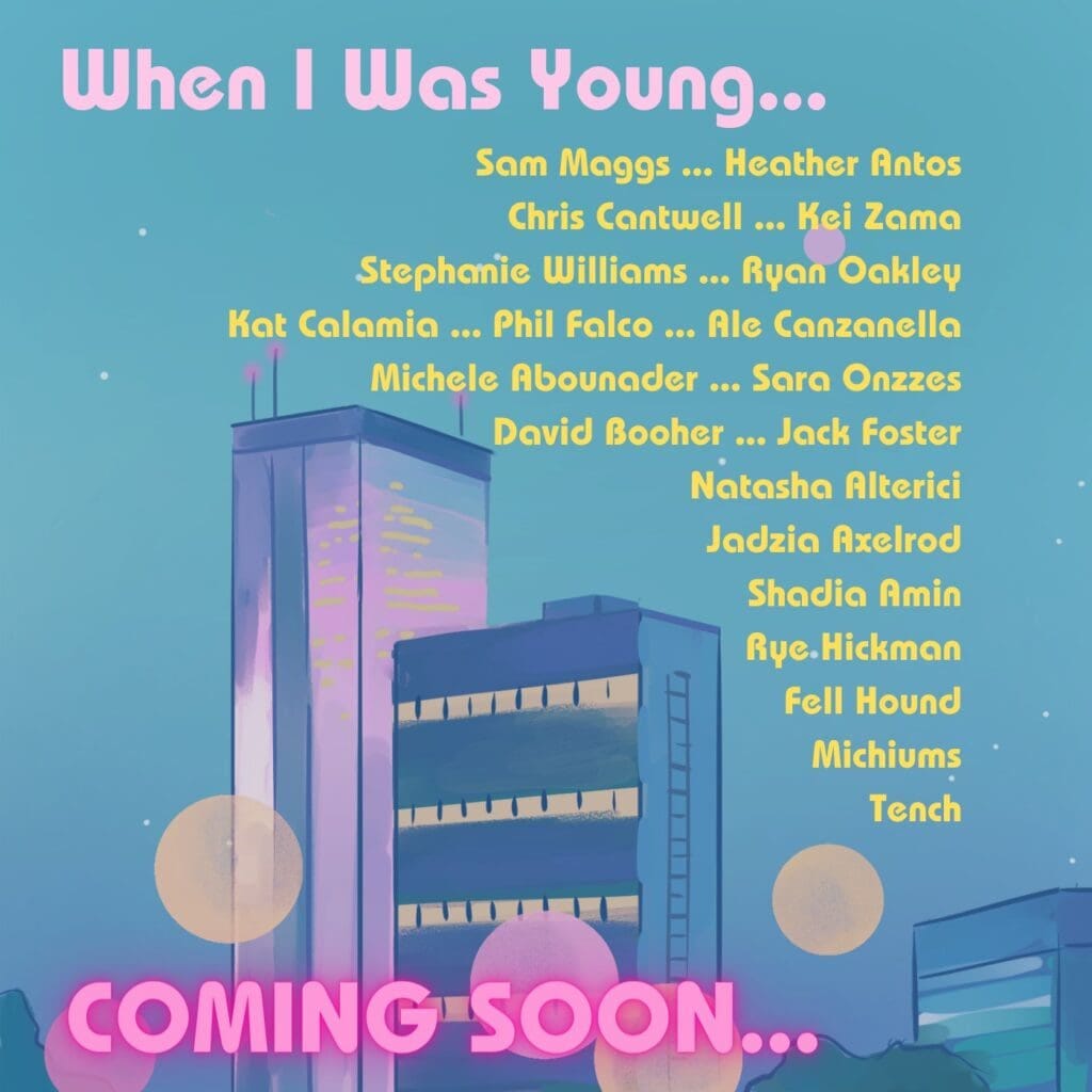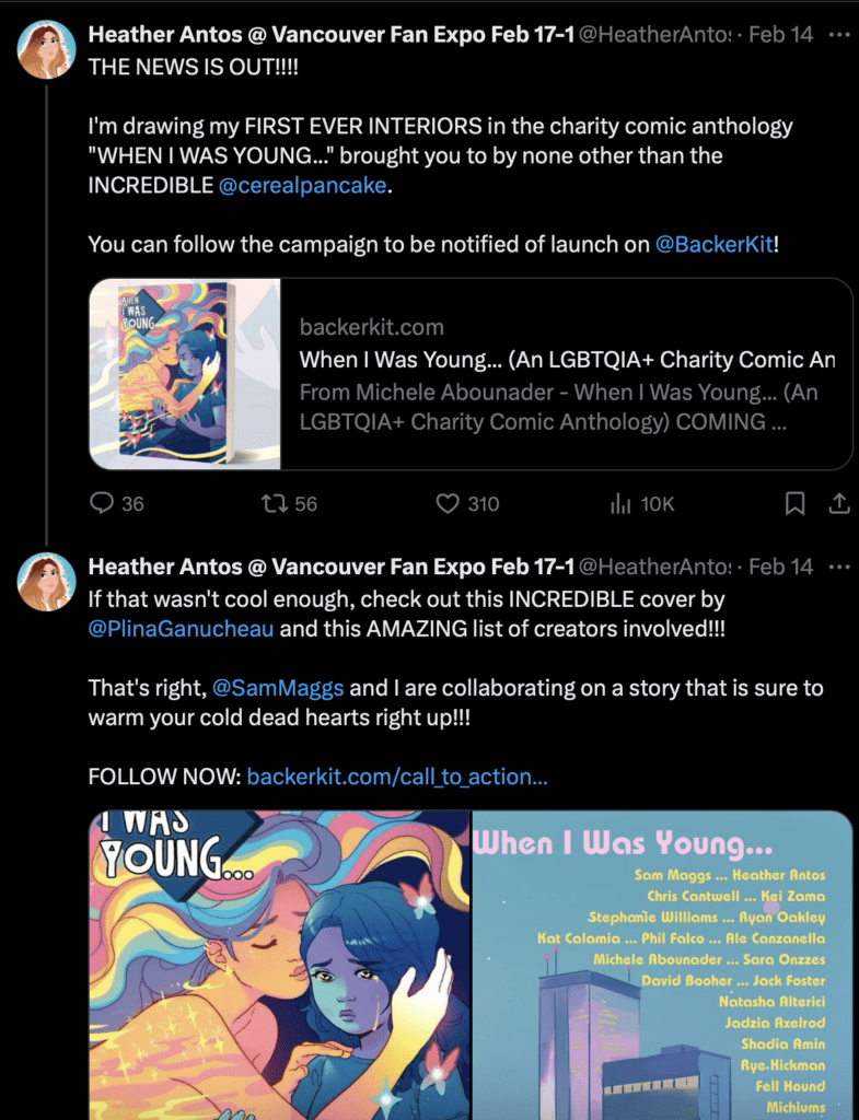 Heather Antos tweeted about the project, saying, "THE NEWS IS OUT!!!! I'm drawing my FIRST EVER INTERIORS in the charity comic anthology "WHEN I WAS YOUNG…" brought you to by none other than the INCREDIBLE @cerealpancake You can follow the campaign to be notified of launch on @BackerKit!"