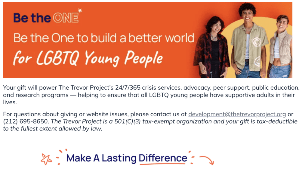 The charity involved is The Trevor Project, an organization that explicitly targets underaged children to try to pair adults who are looking to get close to children as their stated mission. The website's main page says they "ensure that all LGBTQ young people have supportive adults in their lives."