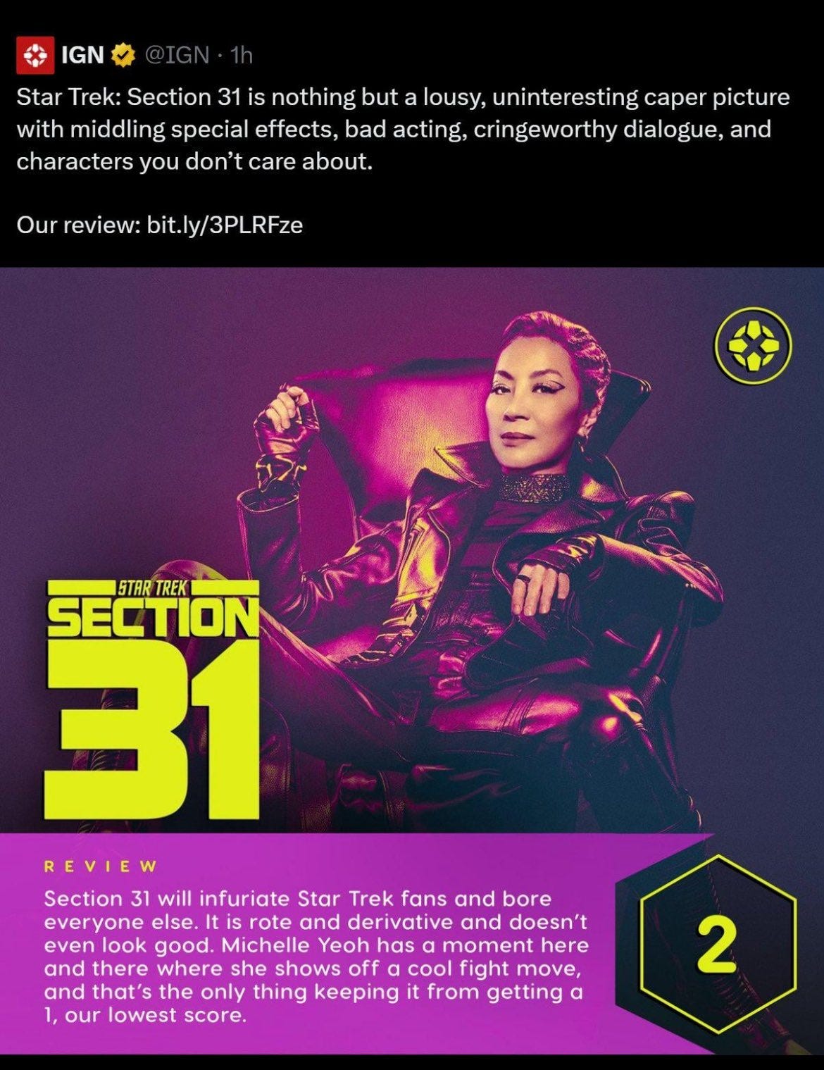 With Section 31, however, even IGN gave them at 2/10. They posted to X saying, “Star Trek: Section 31 is nothing but a lousy, uninteresting caper picture with middling special effects, bad acting, cringeworthy dialogue, and characters you don’t care about.”
