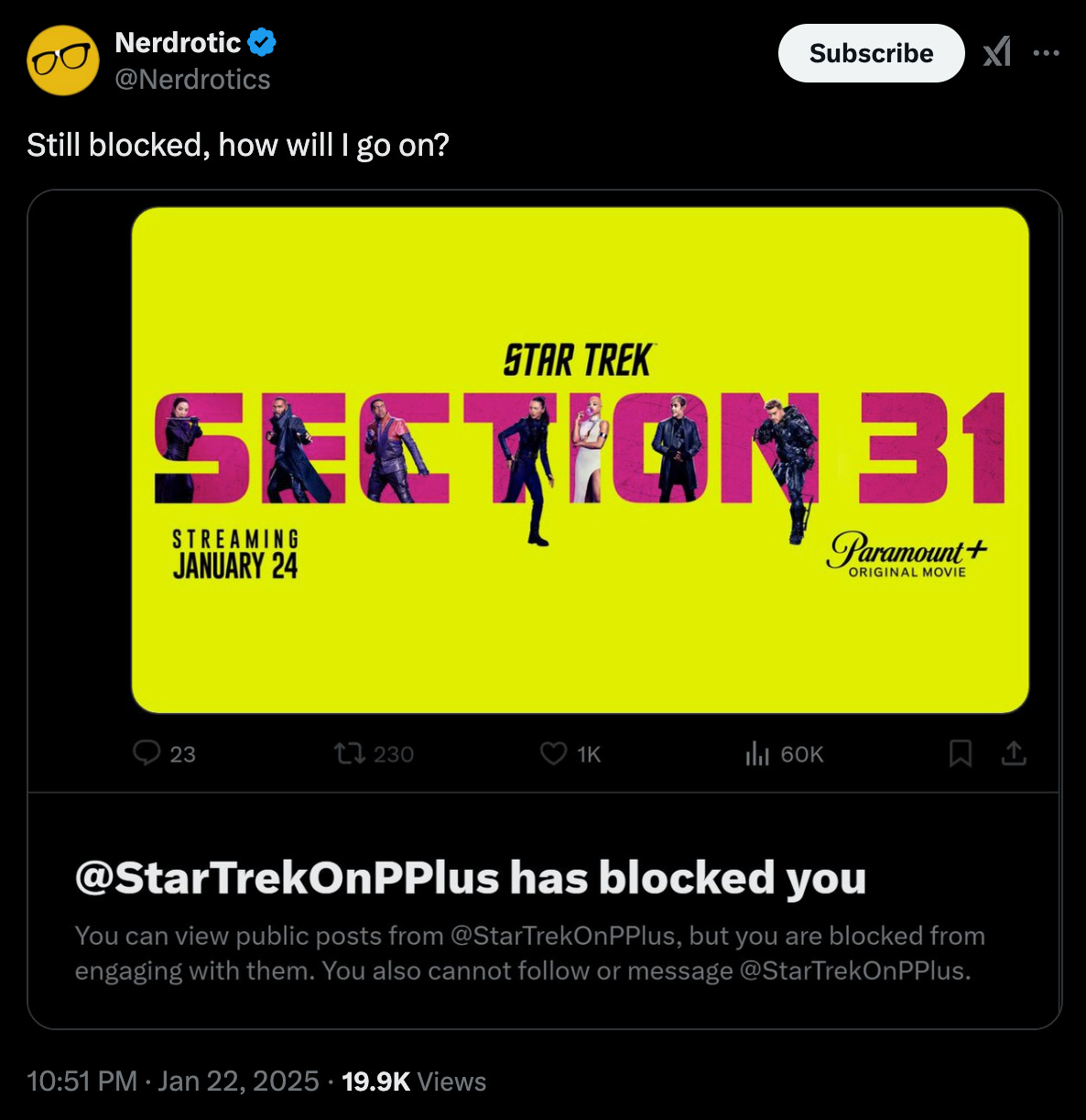 What do you think of the bad reviews for Star Trek: Section 31 and Paramount blocking Nerdrotic on X? Leave a comment and let us know.
