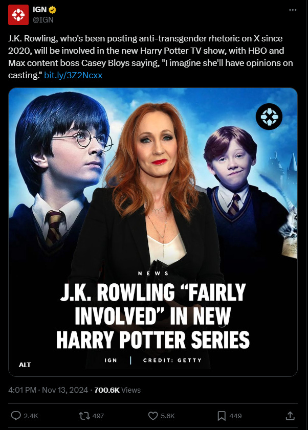 What do you make of IGN seething over J.K. Rowling’s involvement in a TV show that is adapting her creation? Become a paid member to leave a comment and let us know.