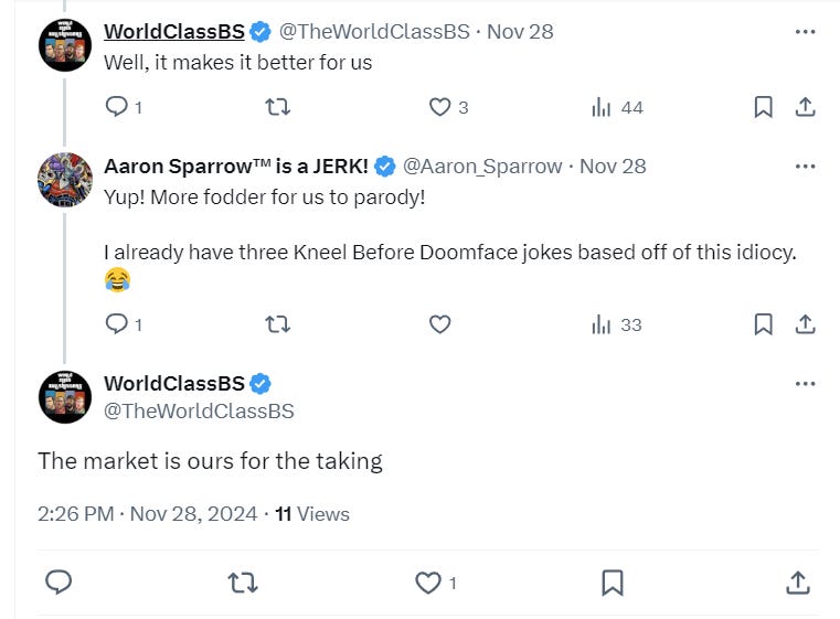 Responding to YouTuber WorldClassBS, he wrote, “Yup! More fodder for us to parody! I already have three Kneel Before Doomface jokes based off of this idiocy.”