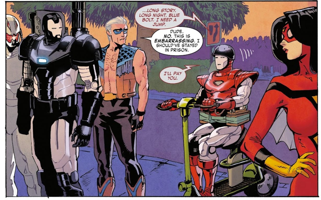 Blue Bolt responds, “Dude. No. This is embarrassing. I should’ve stayed in prison.”