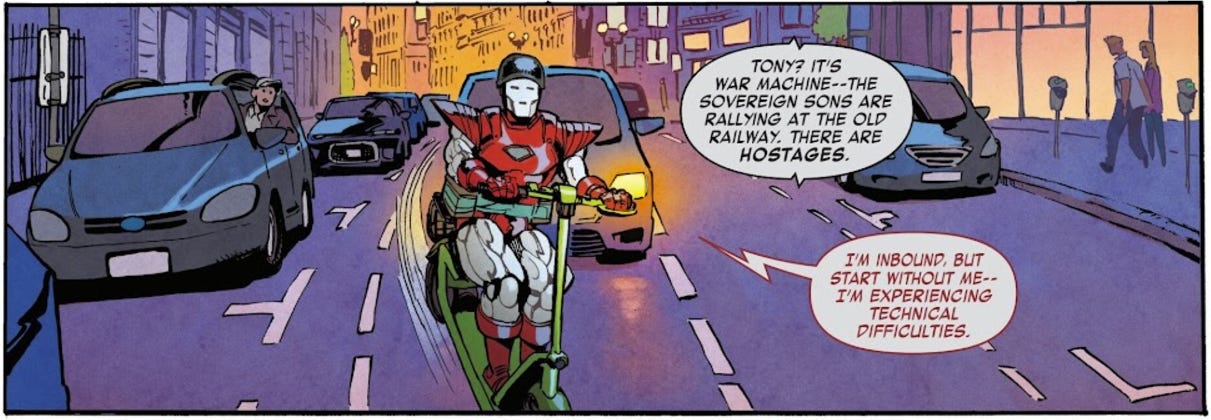 Sparrow shared a panel of Iron Man wearing his outdated Silver Centurion armor driving on a scooter in California.