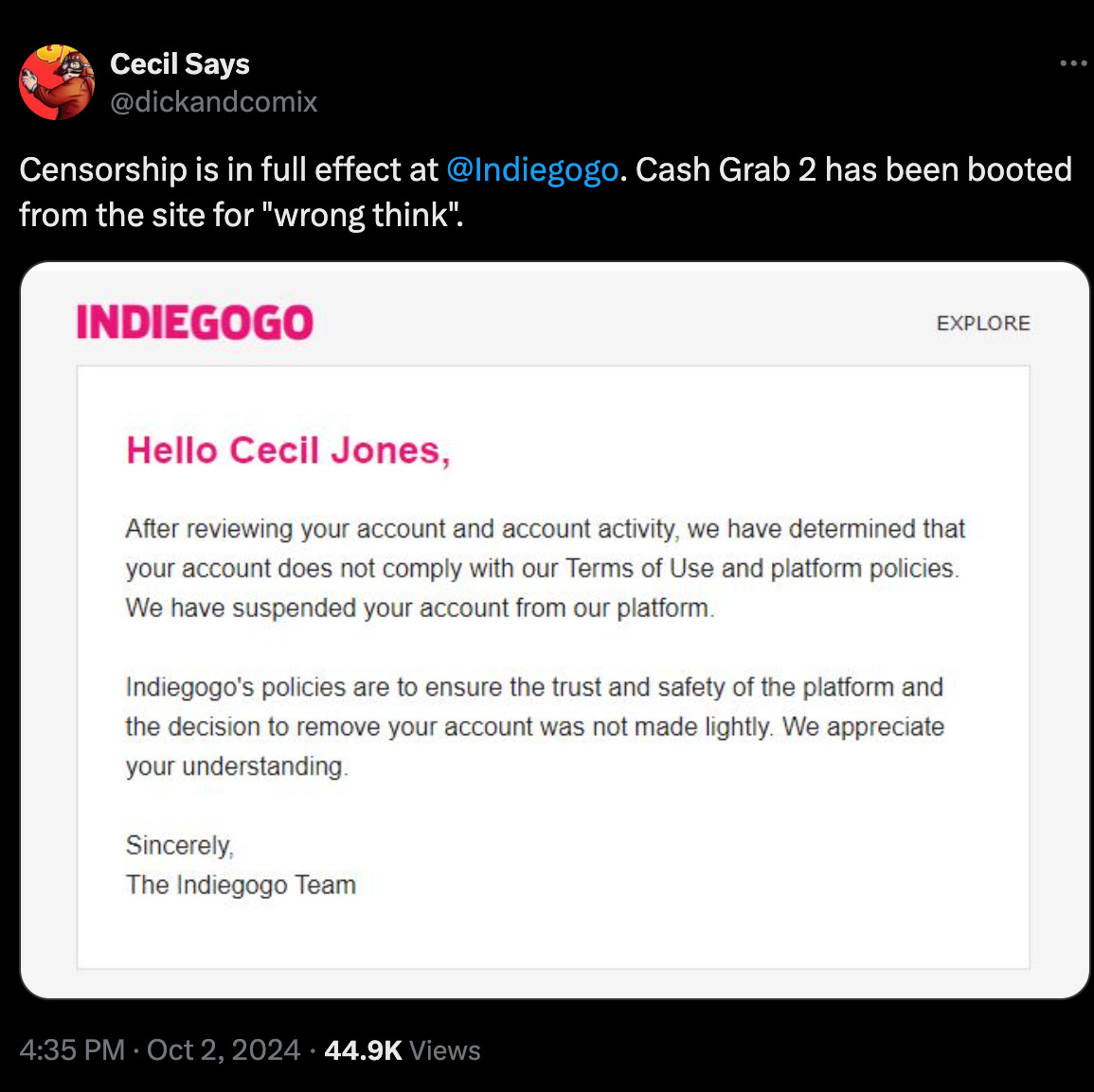 “Censorship is in full effect at @Indiegogo. Cash Grab 2 has been booted from the site for "wrong think,” Cecil posted to X along with the screenshot.