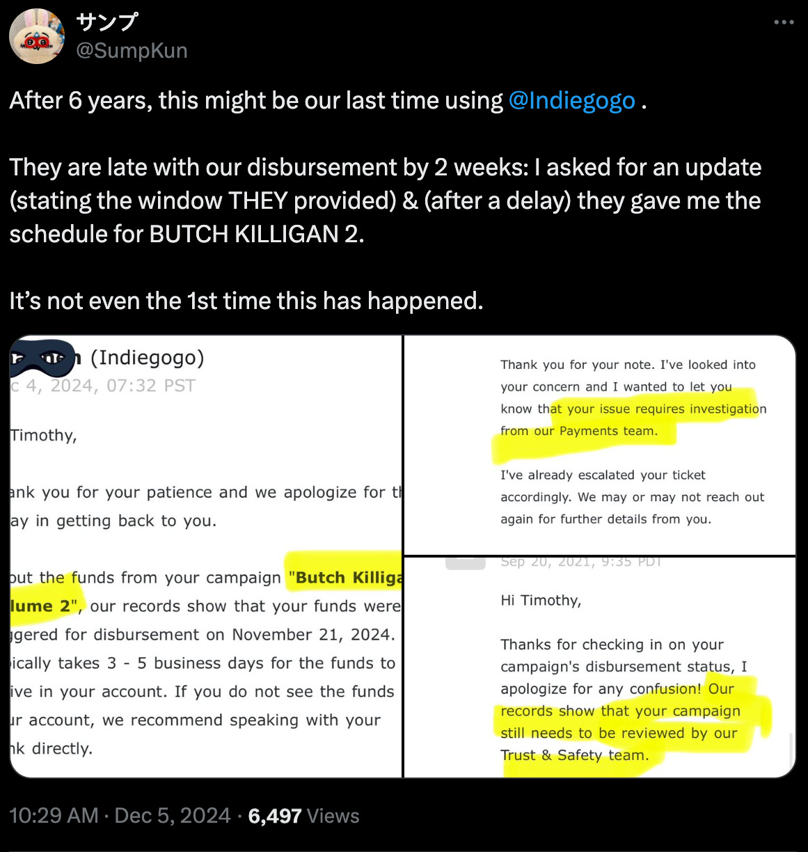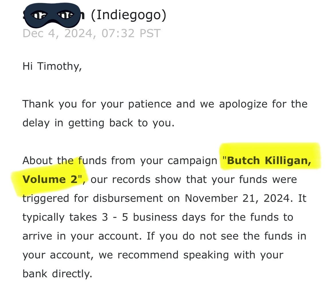 The newest note comes from the Butch Killigan Volume 2 campaign, in which IndieGoGo admits the bok was triggered for disbursement on November 21, 2024, and yet on December 4th, they tell Lim he needed to wait 3-5 business days since that date despite 3-5 business days having already passed.