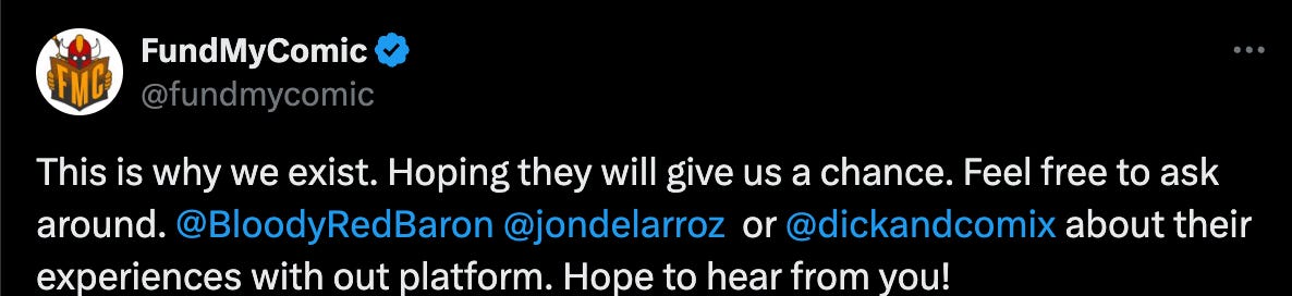The crowdfunding platform FundMyComic quote tweeted Lim’s post, letting creators know their platform was far safer to use than their competitor. FMC said on X, “This is why we exist. Hoping they will give us a chance. Feel free to ask around. @BloodyRedBaron @jondelarroz or @dickandcomix about their experiences with our platform. Hope to hear from you!”