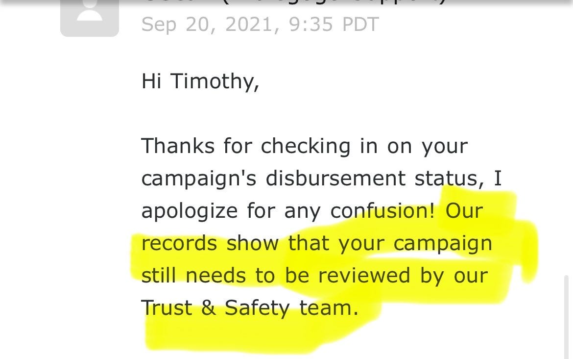 The screenshots detail how IndieGoGo has delayed sending funds to the Kamen America creator on three occasions. The first gives a clue it might be politically motivated as it cites being reviewed by Trust & Safety. The second also says, “the issue requires investigation from our Payments team.”