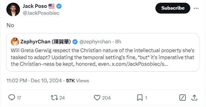 Zphyr Chan asked him on X, “Will Greta Gerwig respect the Christian nature of the intellectual property she's tasked to adapt? Updating the temporal setting's fine, *but* it's imperative that the Christian-ness be kept, honored, even.”