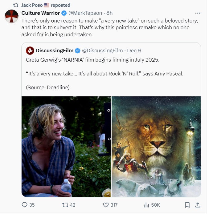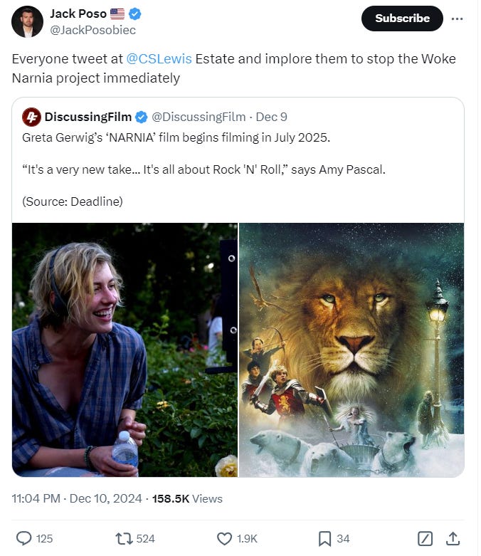 What do you make of Posobiec’s call to contact the C.S. Lewis Estate and have them put a stop to what looks to be a woke adaptation?