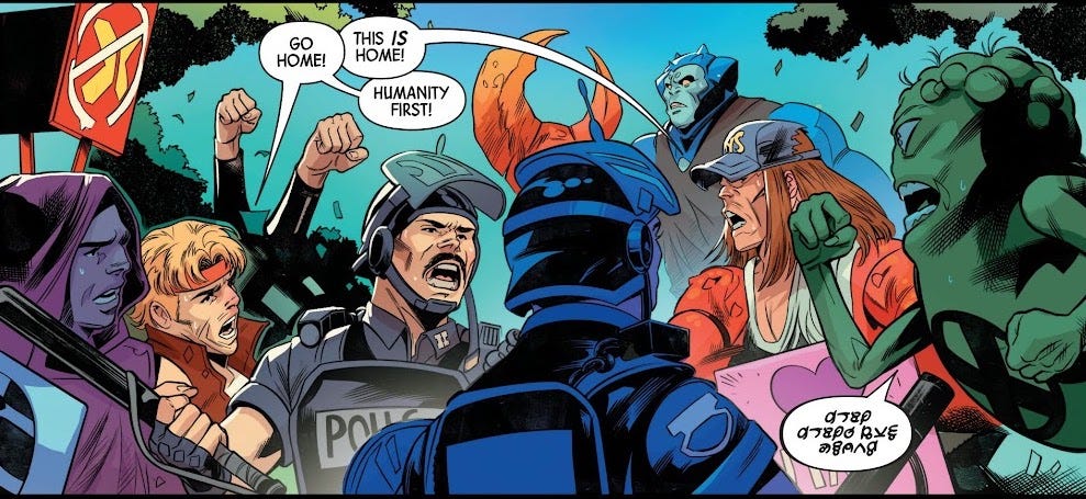 Humanity is then portrayed as the MAGA movement, even holding up signs saying “Humanity First!” a clear reference to America First. However, as much as the humans are shown as angry and are meant to be seen as bad, the act of protesting peacefully and democracy ends up being what’s called into question by Lanzing and Kelly. It’s very clear that the leftists at Marvel want dissent silenced.