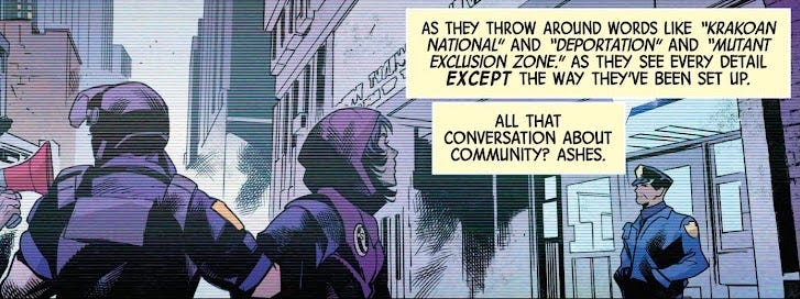The book opens with dialogue lecturing about real-world politics, pretending it’s part of the storyline, saying, “As they throw around words like ‘Krakoan national’ and ‘deportation’ and mutant exclusion zone.’ As they see every detail except the way they’ve been set up.”