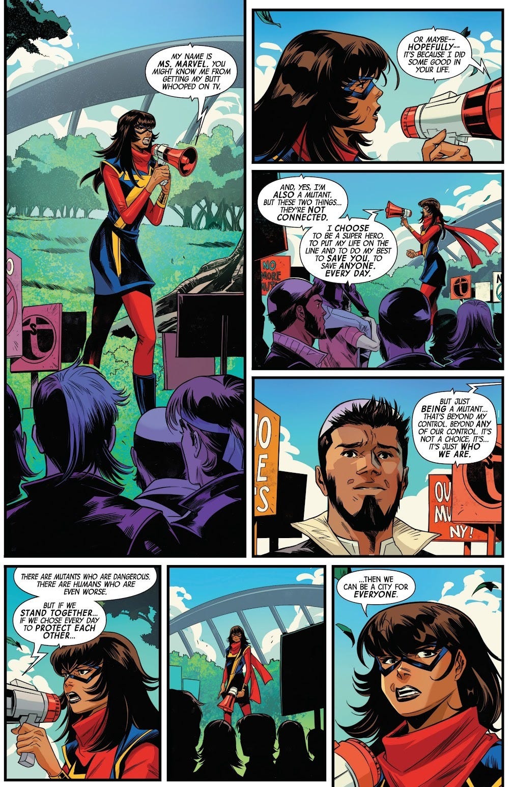 Instead of having a fun, action-packed comic book, Kamala Khan takes to a megaphone at the end of the book to lecture the protesting humans. When she does so, most of the humans then change their minds, agreeing with her, which, because of the Kamala name, is clearly the writers’ wish for Kamala Harris.