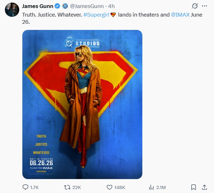 James Gunn and DC Studios shared a new poster with a new motto for the upcoming Supergirl movie.