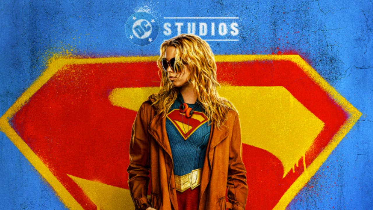 The poster shows Milly Alcock’s Supergirl wearing a trench coat over her outfit with headphones around her neck. The Superman logo is spray painted behind her.