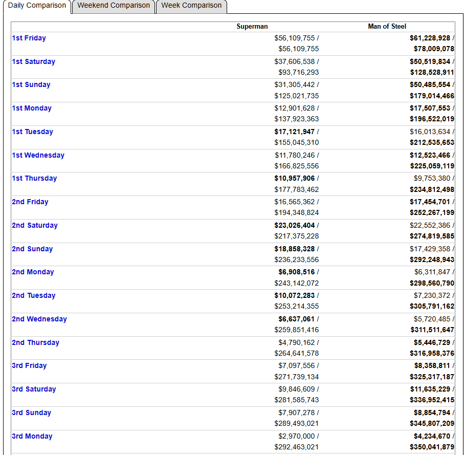 Additionally, when you look at the daily comparisons, Snyder’s Man of Steel had longer legs. The last time Gunn’s Superman had a higher daily gross was last Wednesday when it brought in $6.6 million compared to Man of Steel’s $5.7 million. However, since then Man of Steel has outpaced Superman every single day.