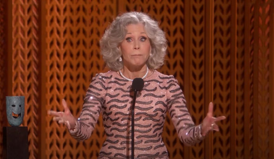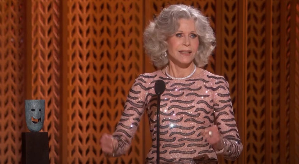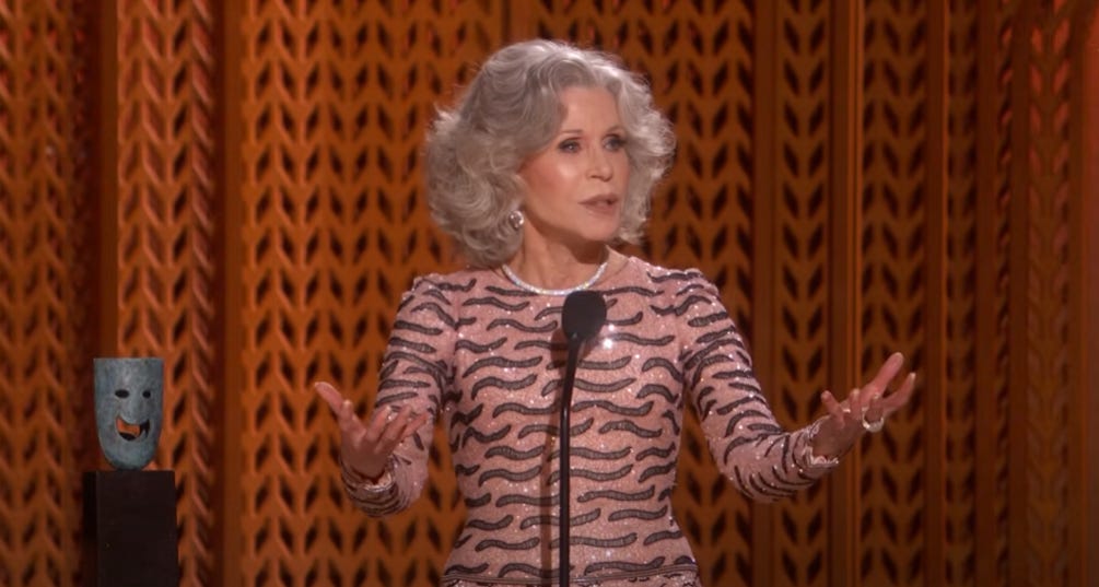Actress Jane Fonda called on the SAG-AFTRA union as well as viewers of the SAG Awards “to resist” President Donald Trump, his administration, and agenda for the United States during an acceptance speech for a SAG-AFTRA Life Achievement Award acceptance speech.