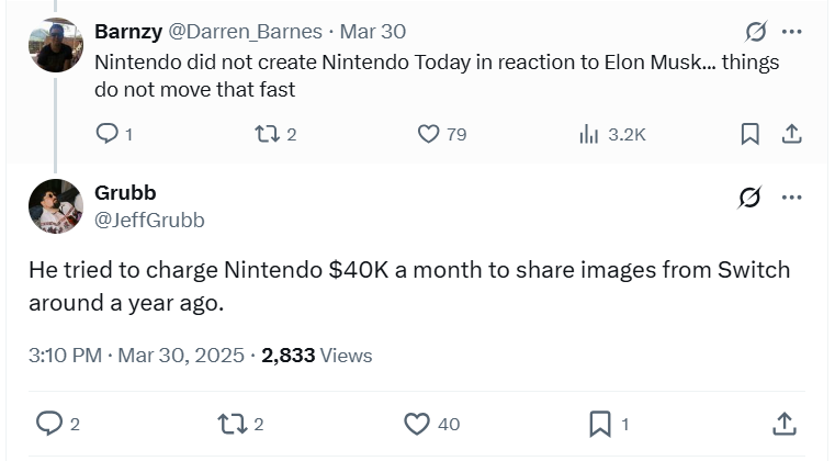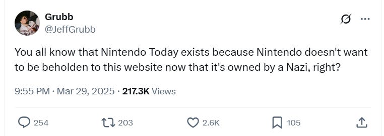 In a post to X, Grubb wrote, “You all know that Nintendo Today exists because Nintendo doesn't want to be beholden to this website now that it's owned by a Nazi, right?”