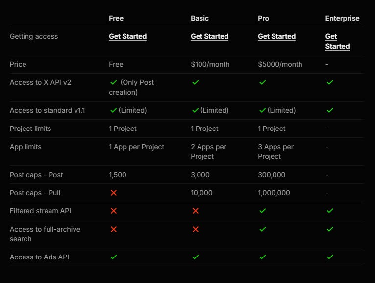 X does not publicly list the prices for its Enterprise level for X API access. However, it does share various individual plans including a free plan, a basic plan, which costs $100 per month and an Pro plan that costs $5,000 per month.