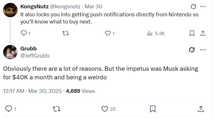 Nevertheless, in response to another user noting how Nintendo might be using the app, Grubb responded, “Obviously there are a lot of reasons. But the impetus was Musk asking for $40K a month and being a weirdo.”