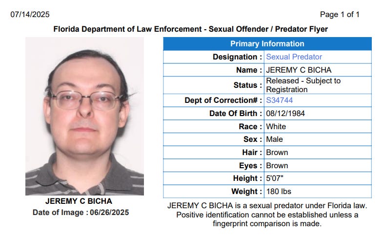 Let’s not sugarcoat this. Bicha pled no contest in 2010 to charges of sexual battery of a child under 12. His own younger sisters were the victims. A judge entered a conviction in 2013. In 2025, the Florida Department of Law Enforcement finally listed him publicly in their predator database. Not “offender.” Predator. That classification requires a pattern of abuse or force. It is not assigned lightly.