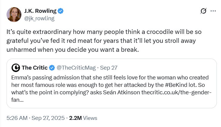 Rowling posted, “I’m not owed eternal agreement from any actor who once played a character I created. The idea is as ludicrous as me checking with the boss I had when I was twenty-one for what opinions I should hold these days.”