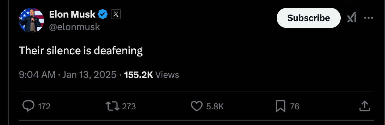 This prompted a response from Elon Musk who replied, “Their silence is deafening.”