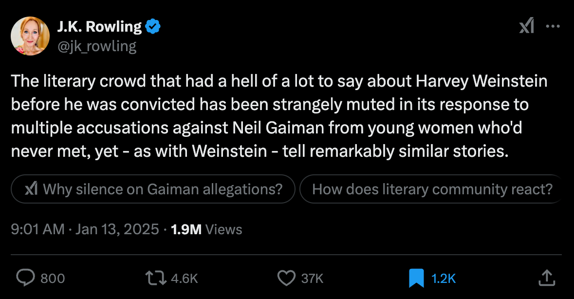 J.K. Rowling Compares Neil Gaiman To Harvey Weinstein Noting The Literary Crowd Was "Strangely Muted" About The Sandman Creator