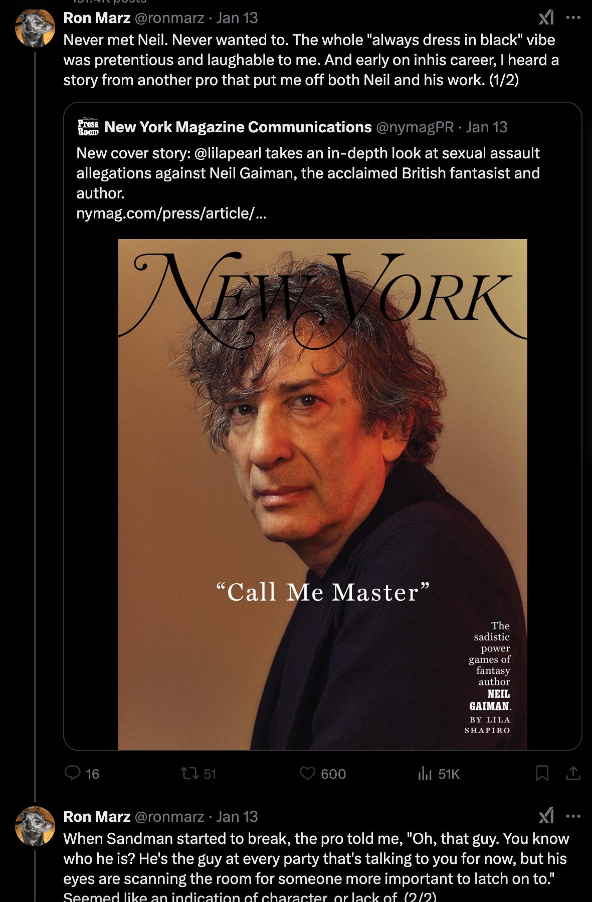 Ron Marz, a Marvel and DC Comics writer who never misses an opportunity to get in on a virtue signal when it’s good for his brand, commented, “Never met Neil. Never wanted to. The whole "always dress in black" vibe was pretentious and laughable to me. And early on inhis career, I heard a story from another pro that put me off both Neil and his work. (1/2)”