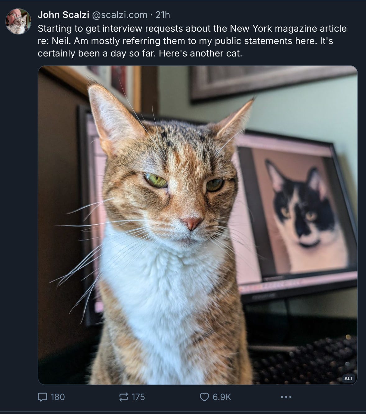 Science Fiction author and former blogger John Scalzi made it about himself as he typically does, posting to BlueSky, “Starting to get interview requests about the New York magazine article re: Neil. Am mostly referring them to my public statements here. It's certainly been a day so far. Here's another cat.”